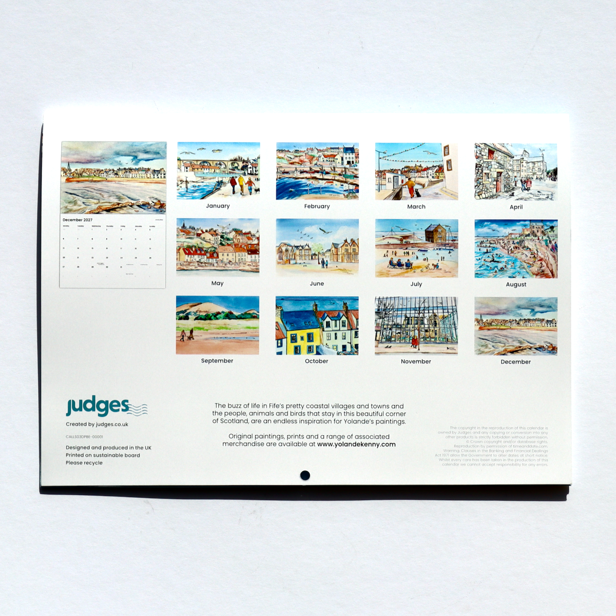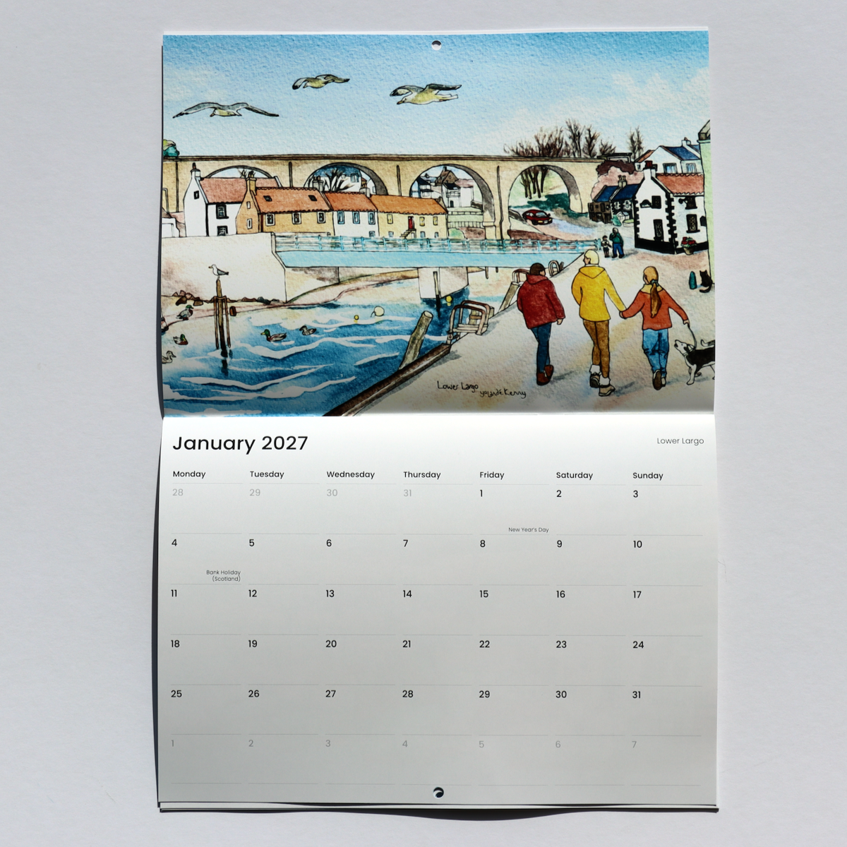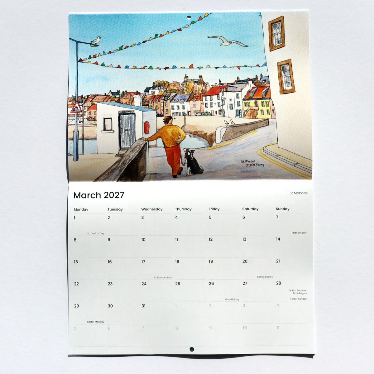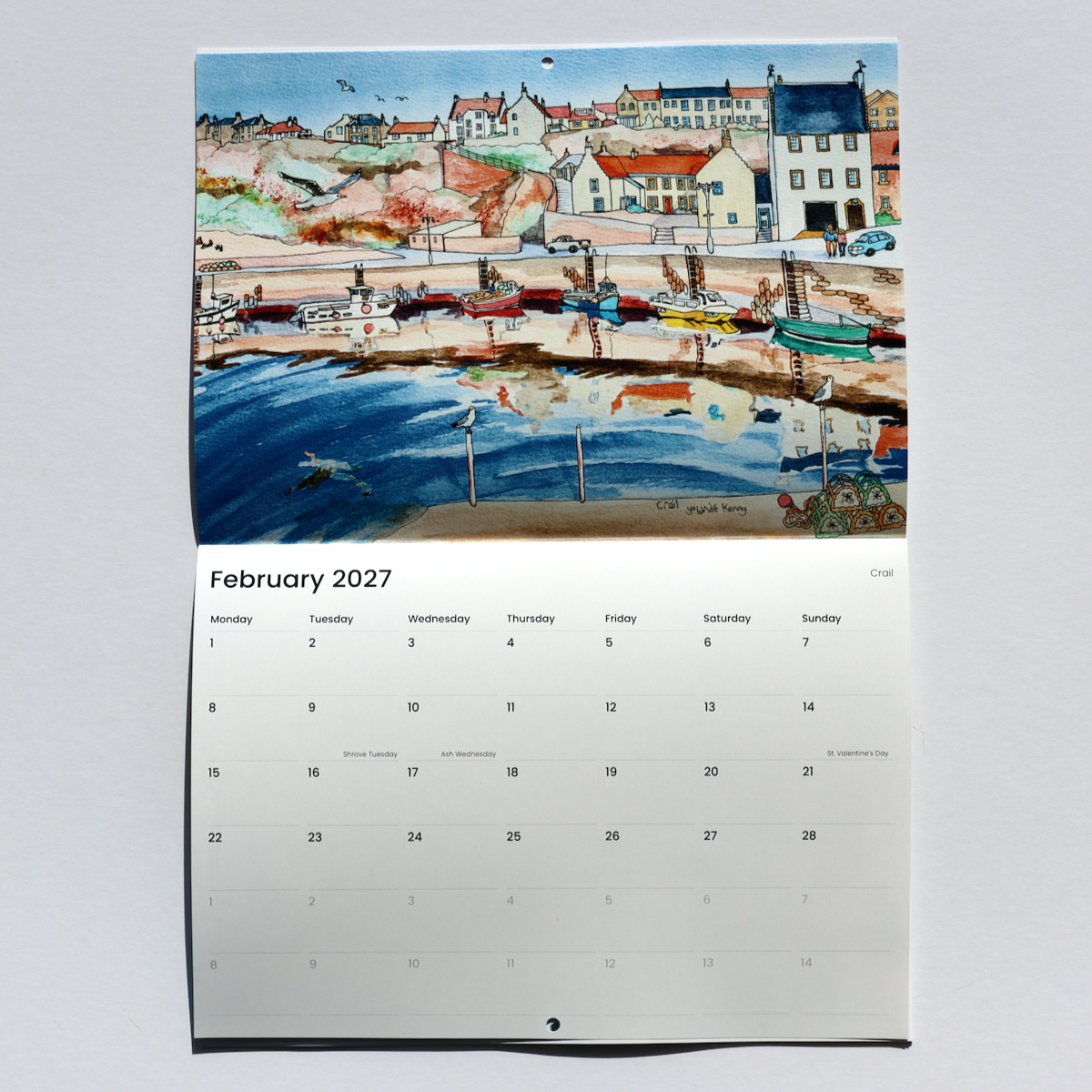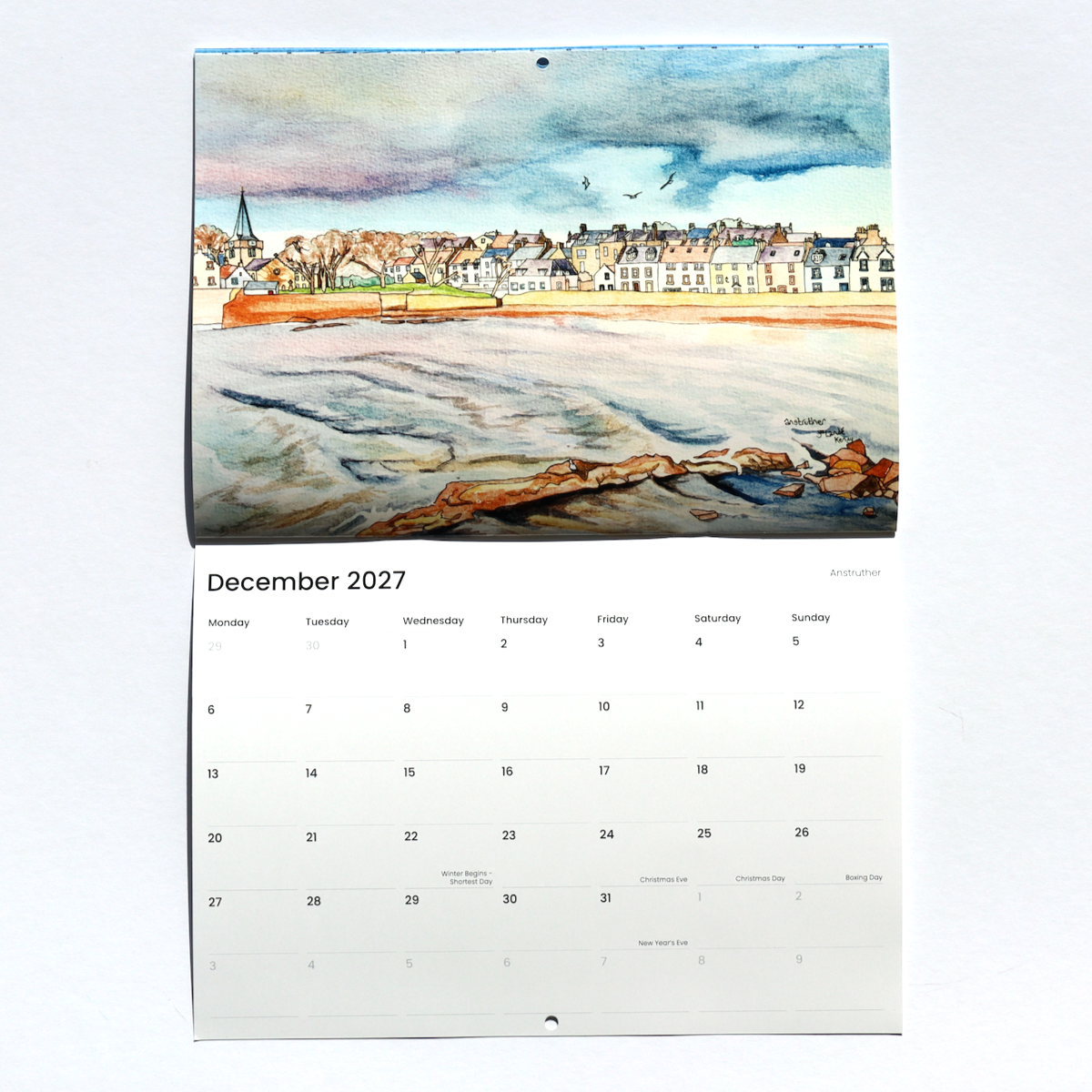Landscape Calendar, A4 size opening to A3, with full colour prints of St Andrews, Crail, Cellardyke, Anstruther, Pittenweem, St Monans, Elie and Lower Largo.