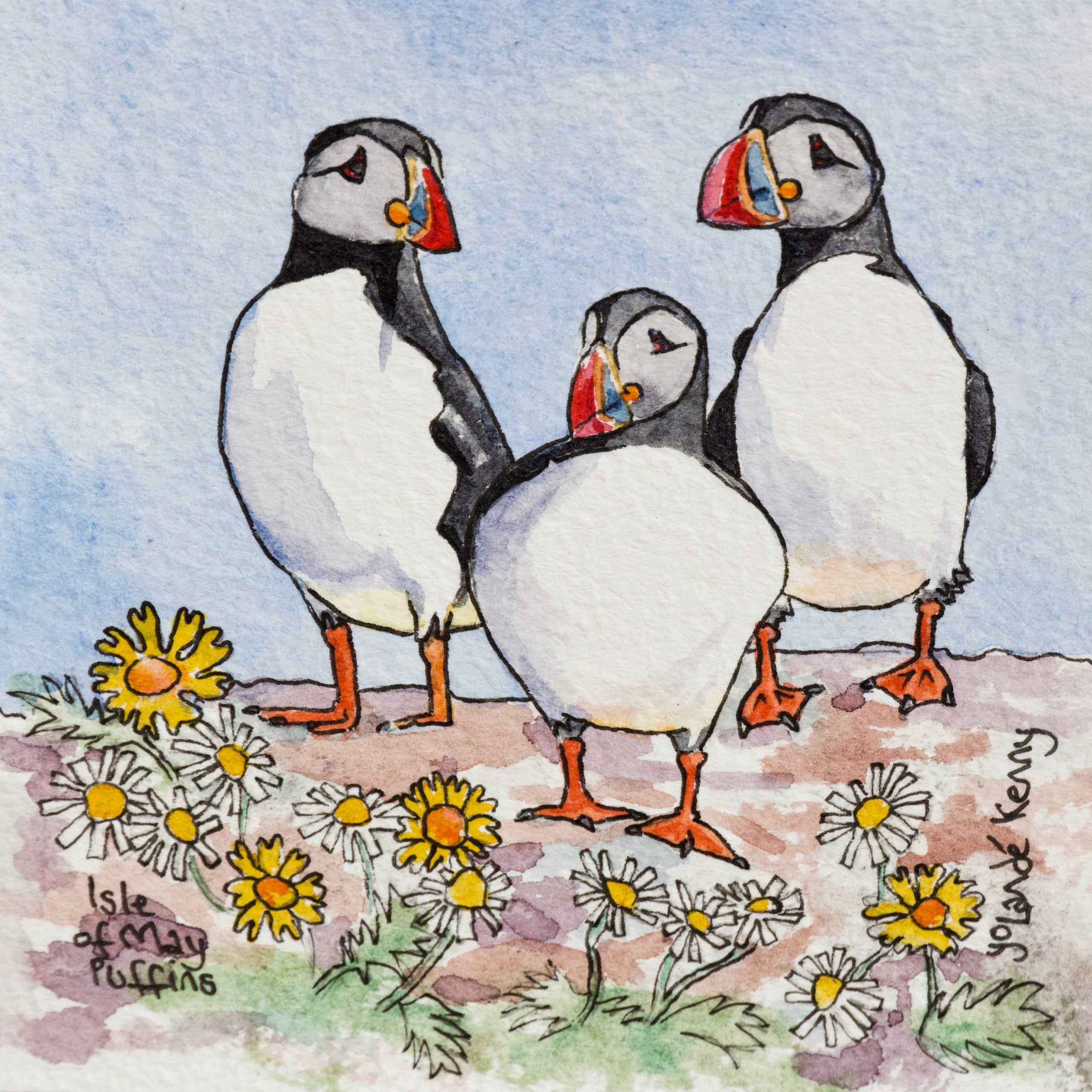 Framed Original Watercolour ‘3 Isle of May Puffins’.