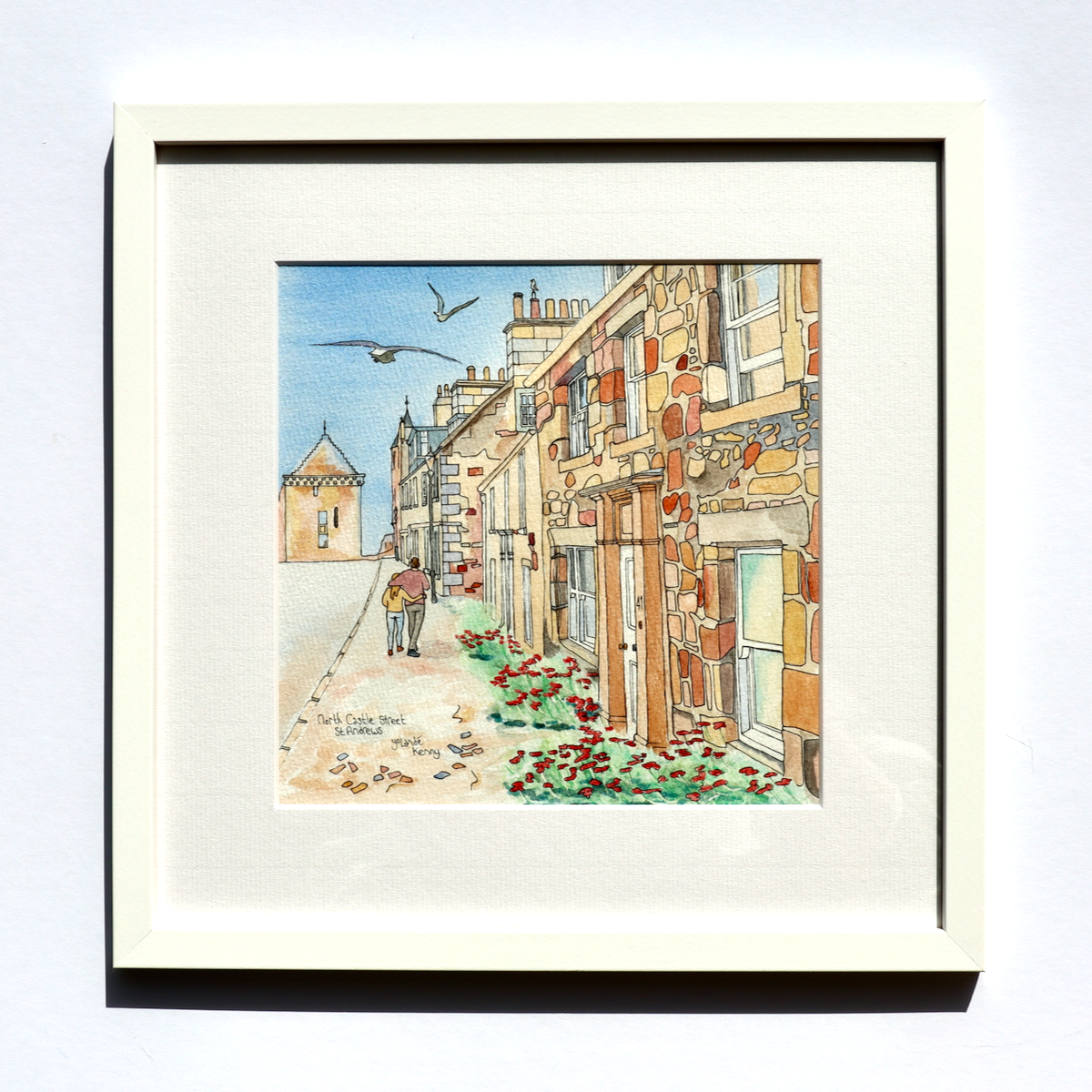 This watercolour is mounted and framed with white wood to an overall size of 320 x 330mm (approximately 13″ x 13″).