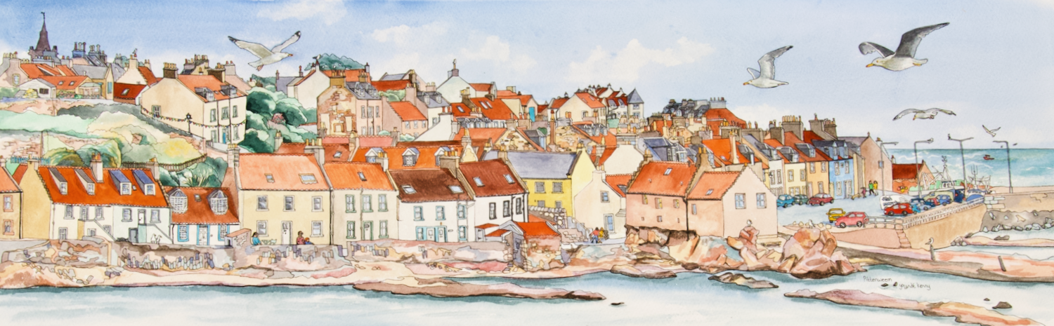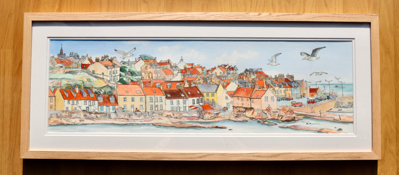 Double mounted and framed in light wood, this panoramic watercolour painting of Pittenweem’s shore has an overall size of 88 x 36cm (approximately 22.5 x 14″).